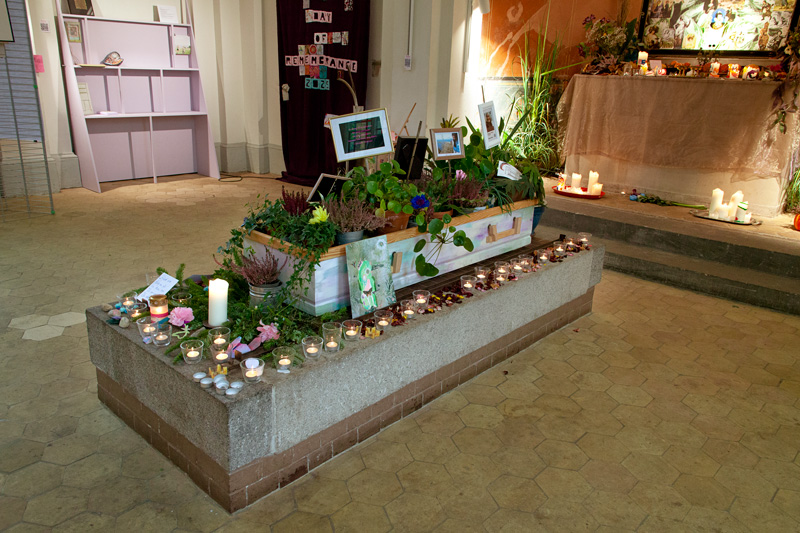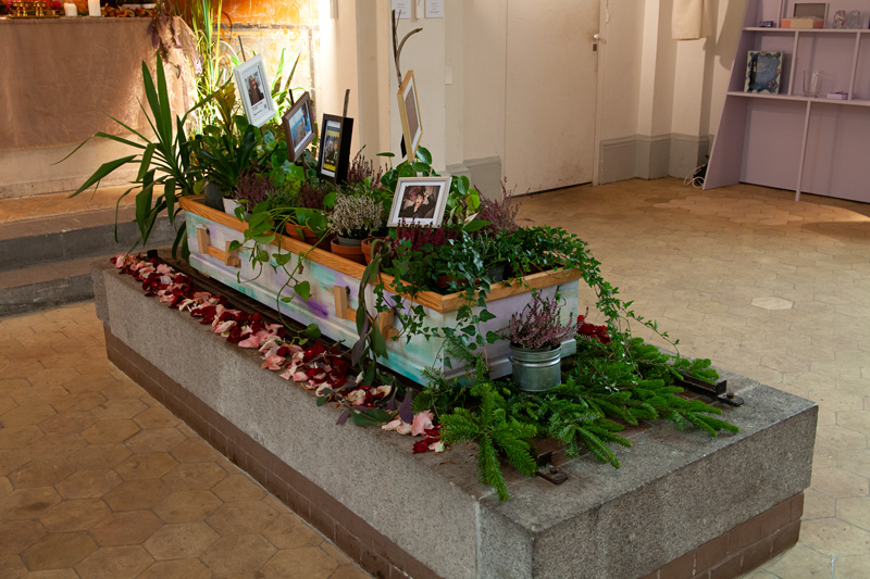 Die interaktive Installation „Ihr seid unter“ uns, verbindet das Erinnern an längst verstorbene Trans*-Ahn*innen mit dem Gedenken an kürzlich verstorbene Trans*-Menschen. Die interaktive Installation besteht aus zwei Teilen: In einem Sarg, aus dem eine Fülle an Pflanzen wächst, erinnern Fotos an verstorbene Trans*-Personen. Auf dem ehemaligen Altar der Kapelle erinnert eine Collage an Trans*-Personen der frühen europäischen Geschichte, denen Opfergaben dargereicht werden. In dieser Zweiteilung stellen wir uns als heutige Trans*-Personen in die Tradition einer langen, aber oft vergessenen Geschichte und bekommen so eine spirituelle Heimat.