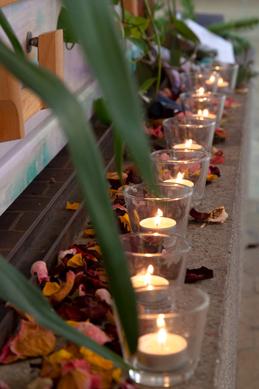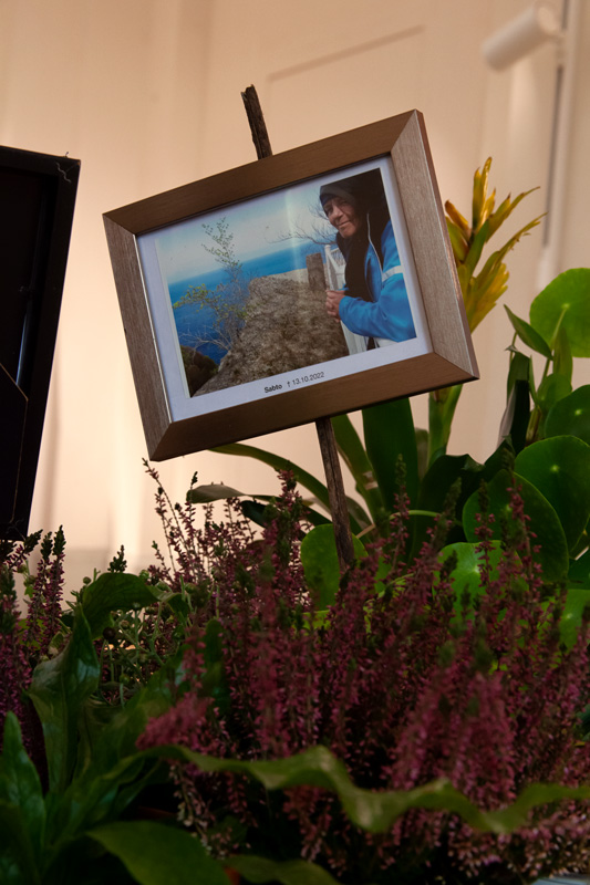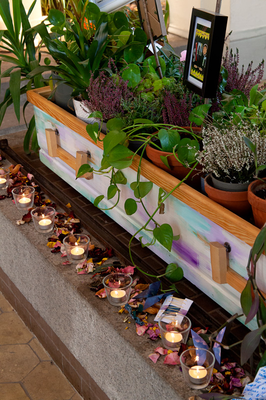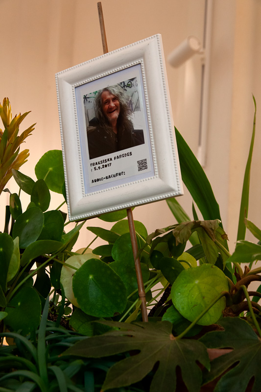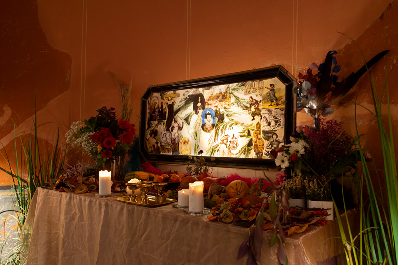 Anlässlich der Ausstellung „Queer Lives, Queer Loss, Queer Mourning“ entstand „Ihr seid unter uns“ in der Kiezkapelle Berlin auf dem Altar und der ehemaligen Aufbahrung. Die Kapelle ist für kulturelle Zwecke umgenutzt, der ehemalige Friedhof beherbergt inzwischen das Kollektiv der Prinzessinnengärten. An diesem besonderen Ort war es mir ein Anliegen, durch die Installation einen Anker in der Mitte des Raumes zu geben, an dem die Menschen zusammenkommen und gedenken können. Die Bilder der verstorbenen Trans*-Personen sind Einsendungen, die auf einen Call gefolgt sind. Die Besuchenden vor Ort waren dann dazu eingeladen, den Trans*-Ahn*innen eine Opfergabe auf dem Altar zu bringen oder ein Erinnerungsstück oder Foto einer verstorbenen Trans*-Person in die Pflanzen-Installation zu integrieren, was im Verlauf der Ausstellung rege in Anspruch genommen wurde. So fanden unzählige Kerzen, Bilder, Blumen und kleine Artefakte ihren Weg in die Installation, die dadurch zu einem Community-Projekt wurde. Dem Altar wurden weitere Ahn*innen und Opfergaben hinzugefügt.