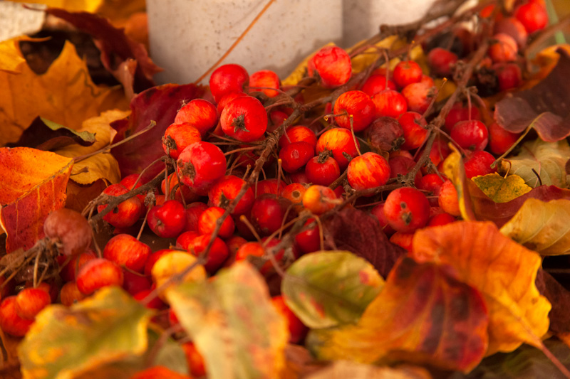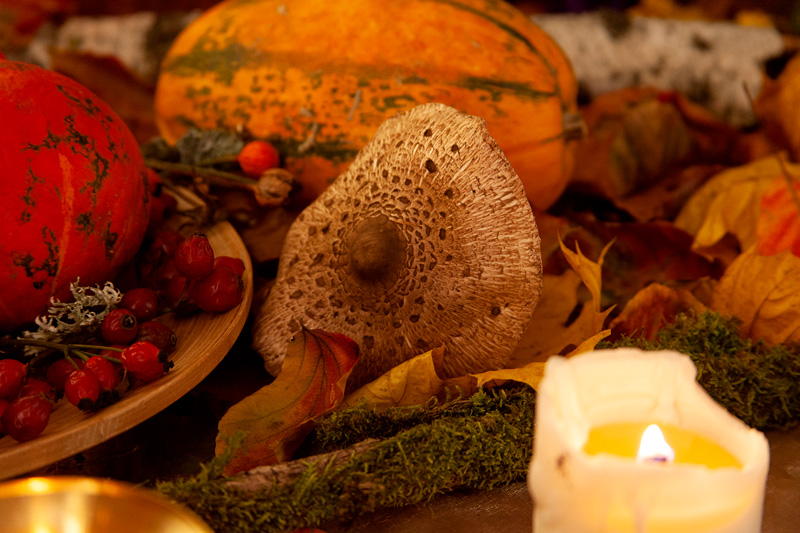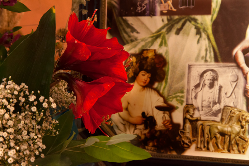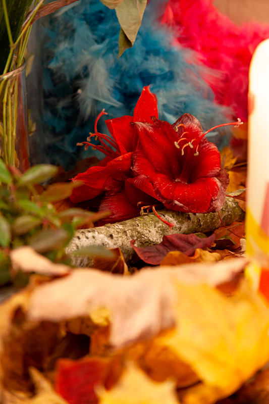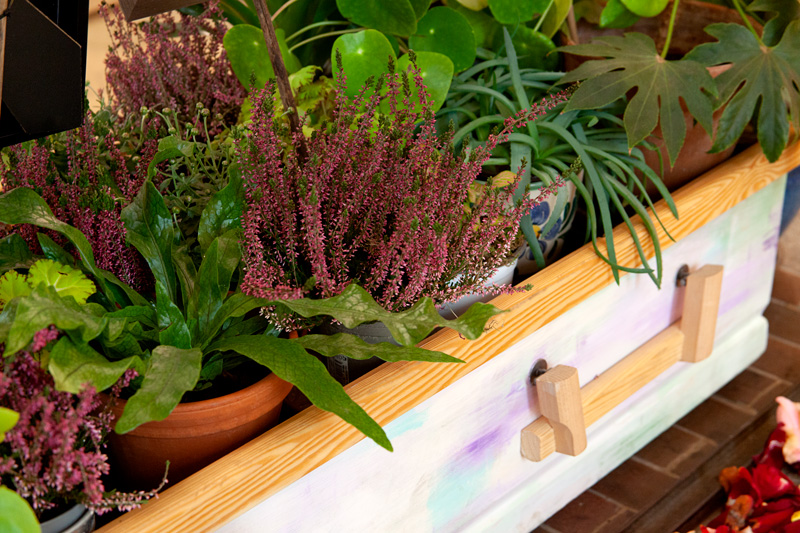 Sarg, Pflanzen, Fotografien, Collage, Altar, Mandarinen, Kürbis, Blätter, Blumen, Federboas